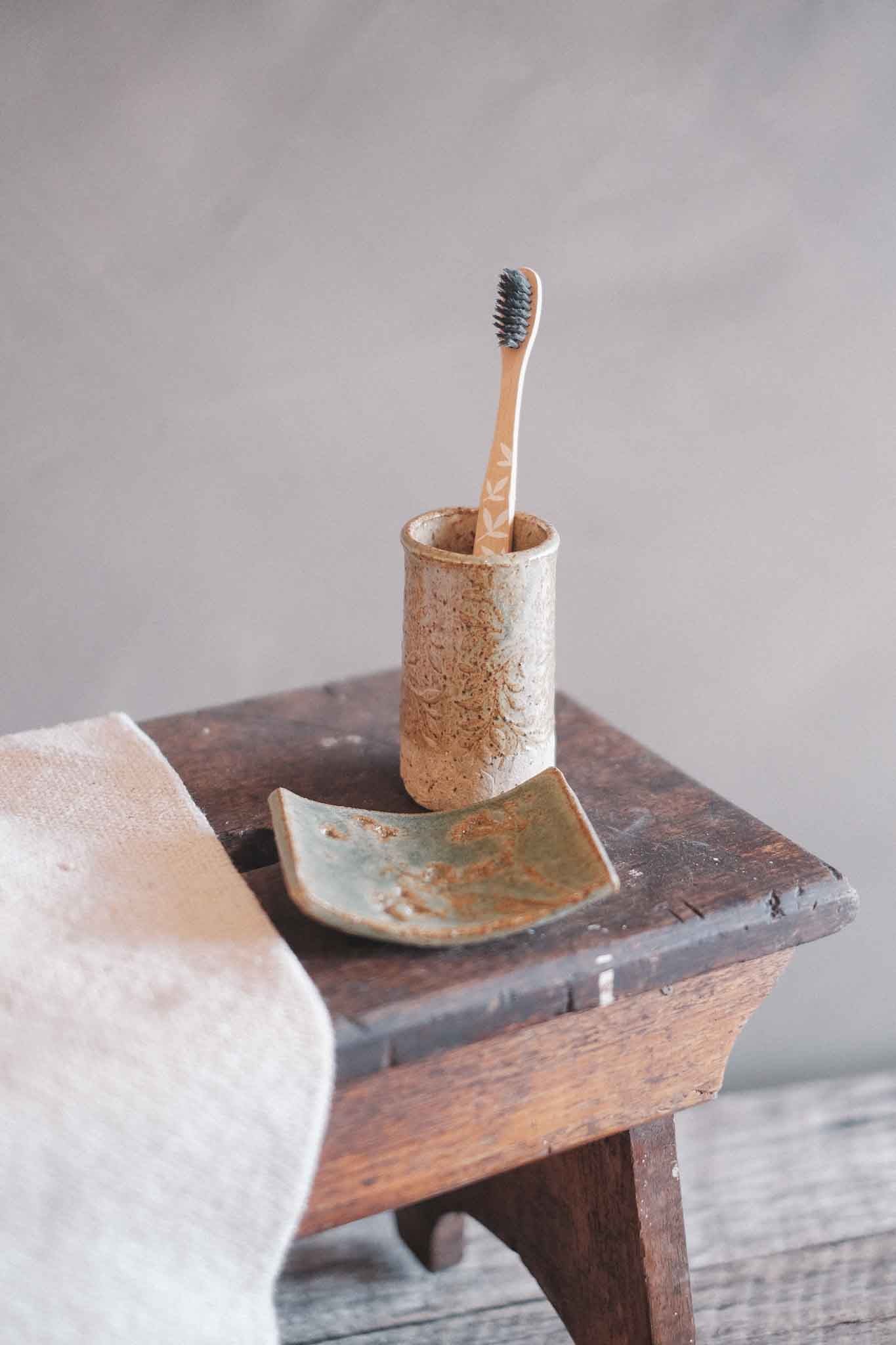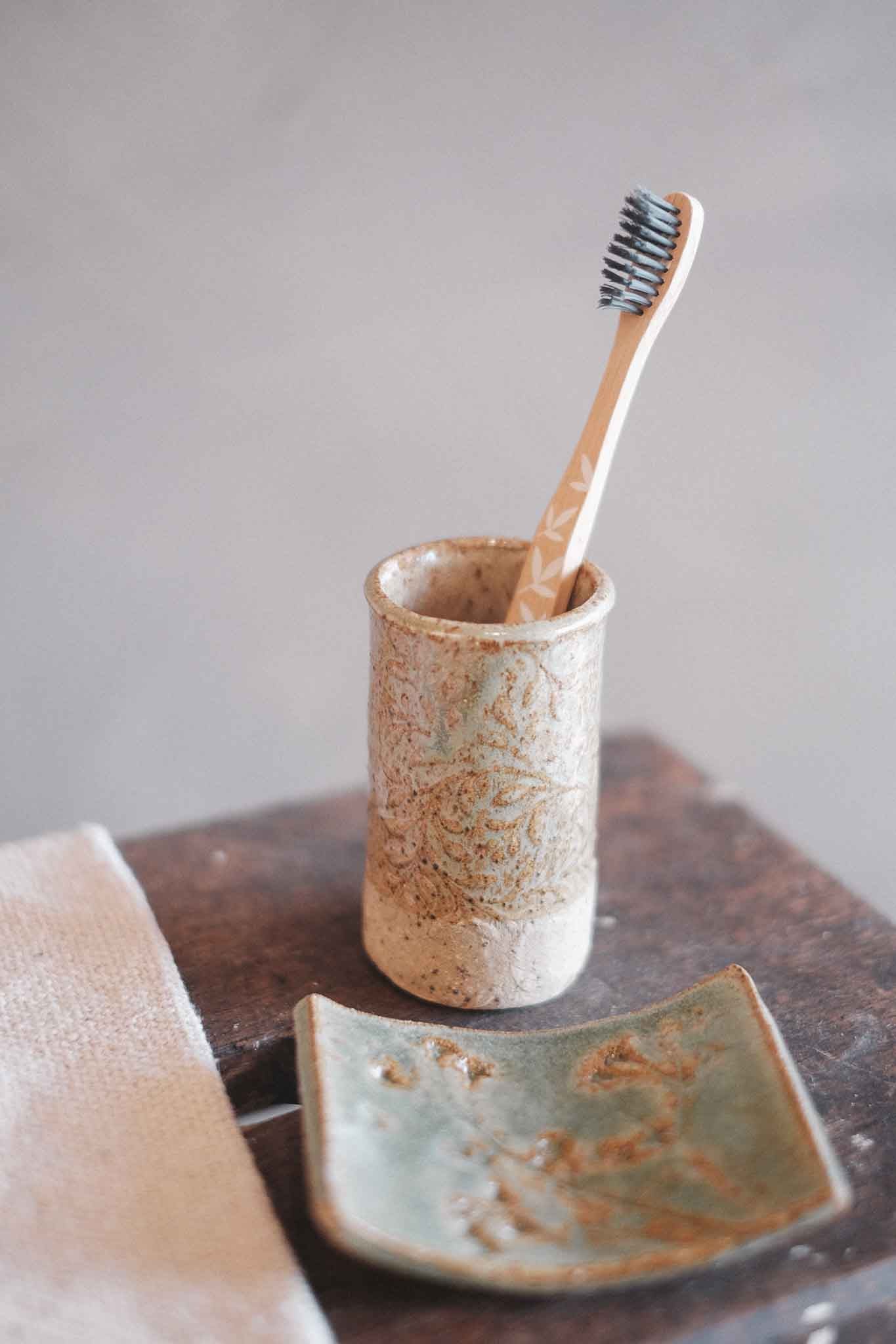 A versatile little vessel for, well, anything and everything — toothbrushes on the counter, pens on the desk, or a few stems of spring flowers. Each piece is hand formed and pressed with a delicate floral pattern reminiscent of antique pottery, yet grounded in a modern, wabi-sabi simplicity. Glazed in our subtle sage for an earthy, timeless feel.