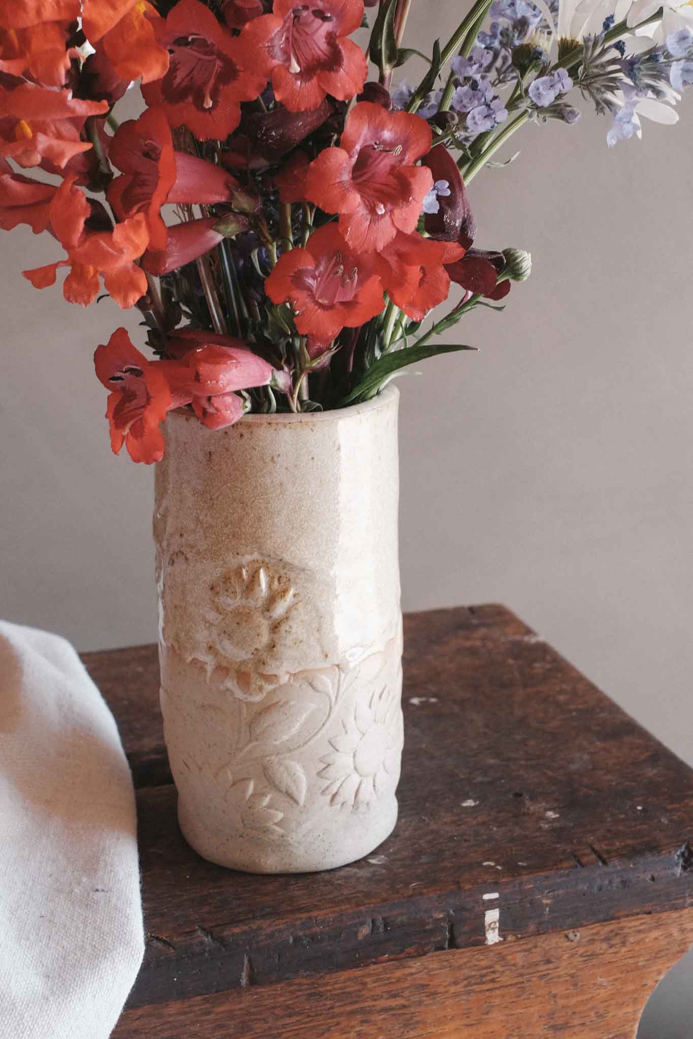 A tall, elegant vase crafted from hand-rolled slabs and pressed with delicate floral imprints. The texture catches the light beautifully, giving the whole piece a quiet, timeless charm.