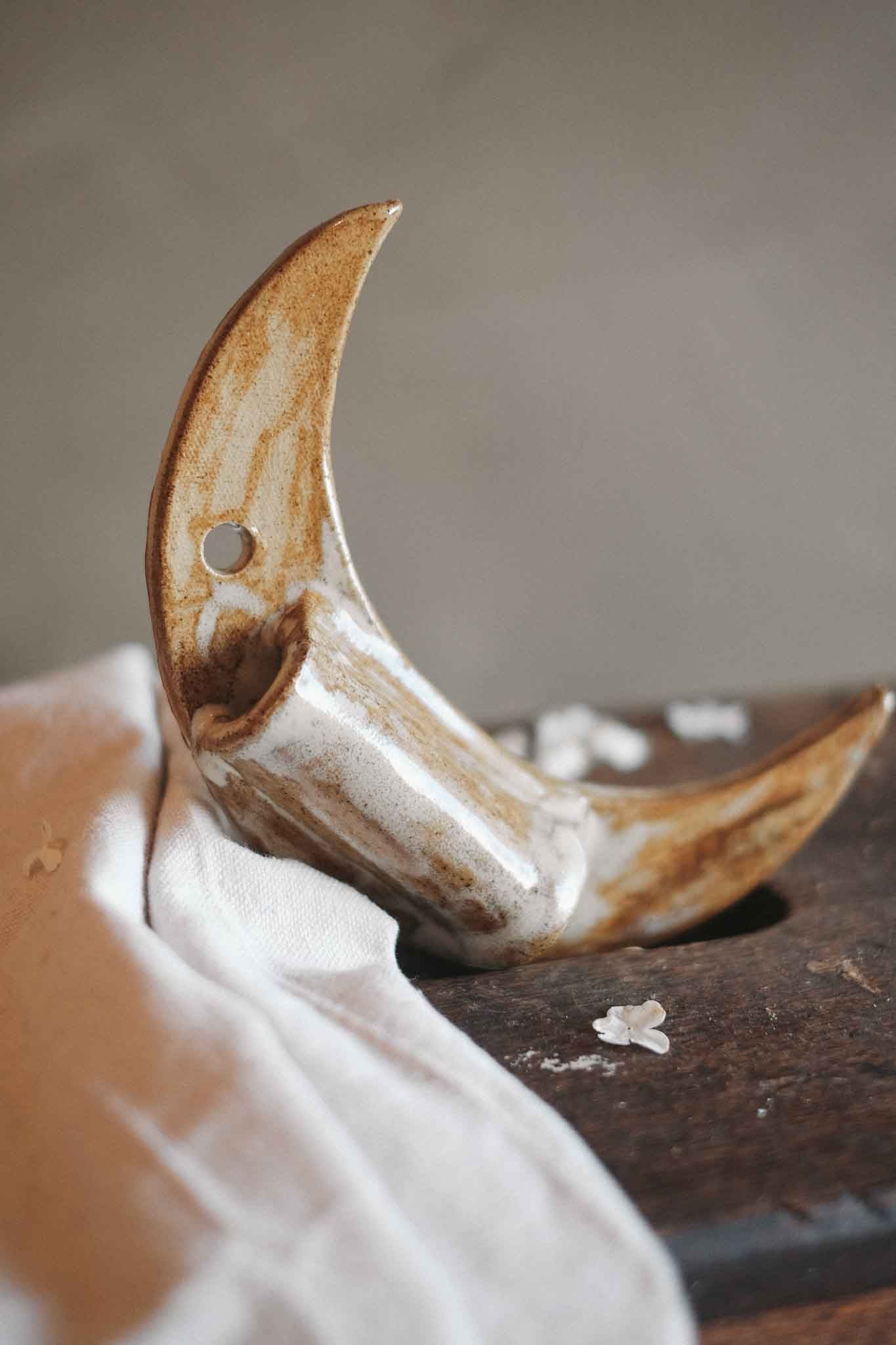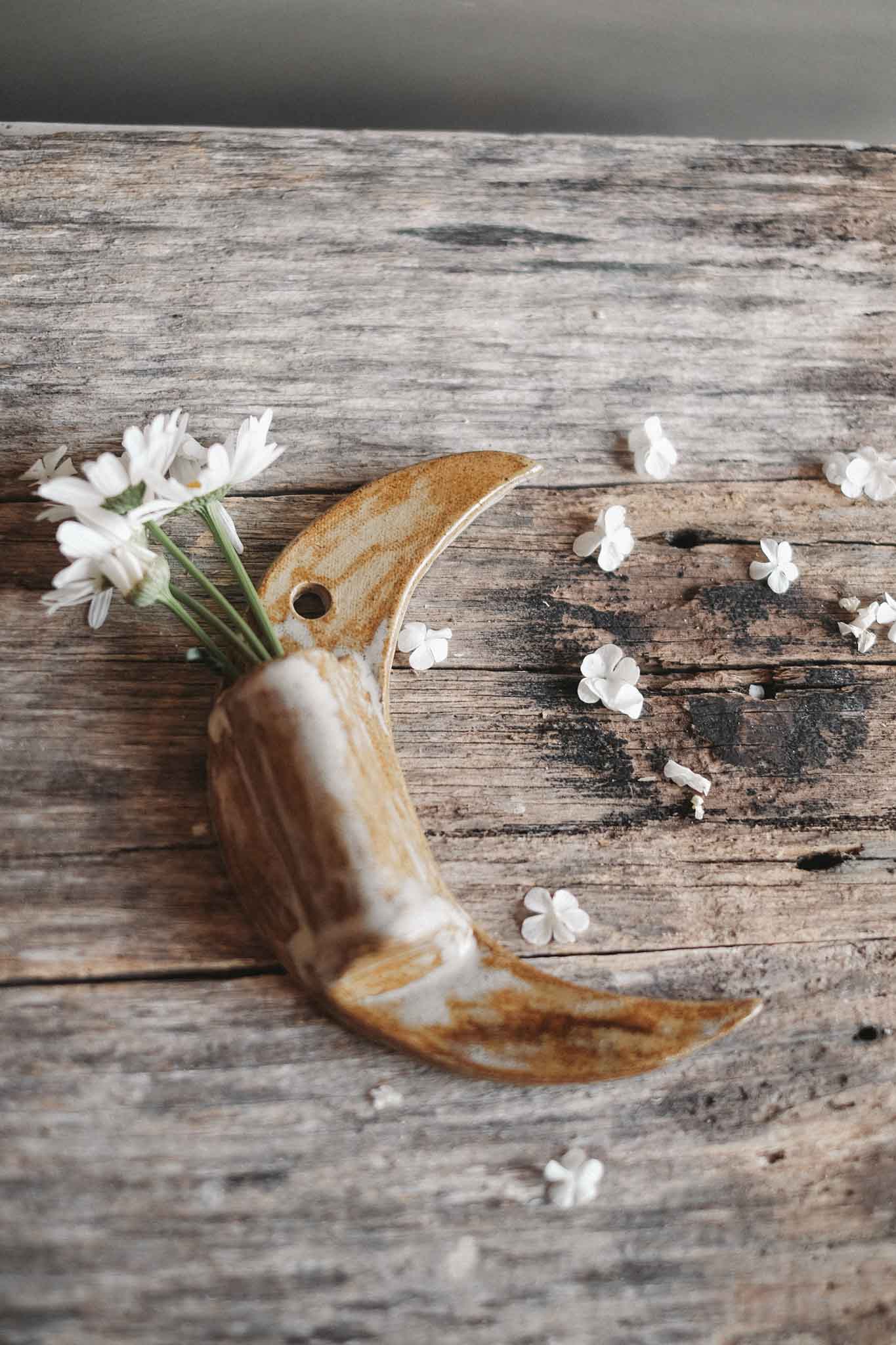 Hand-formed with care, this crescent moon wall planter is both vessel and sculpture. Its curved form creates a striking silhouette, designed to cradle a select few blooms, sprigs of dried foliage, or a single stem that deserves the spotlight. Even left unfilled, it serves as a sculptural wall piece—earthy, modern, and timeless in its simplicity. A piece that shifts with the seasons, it brings quiet beauty to your space in any form.