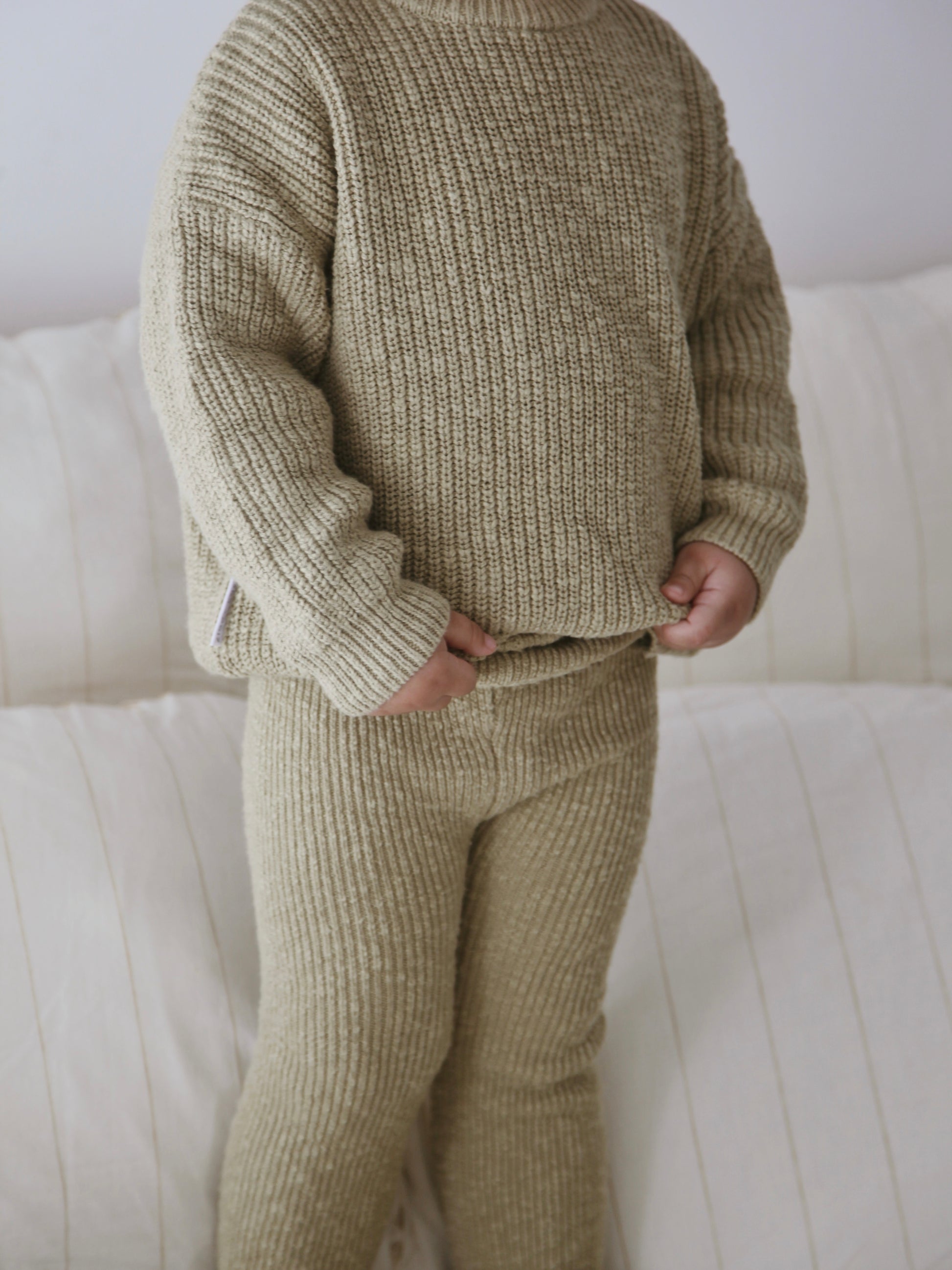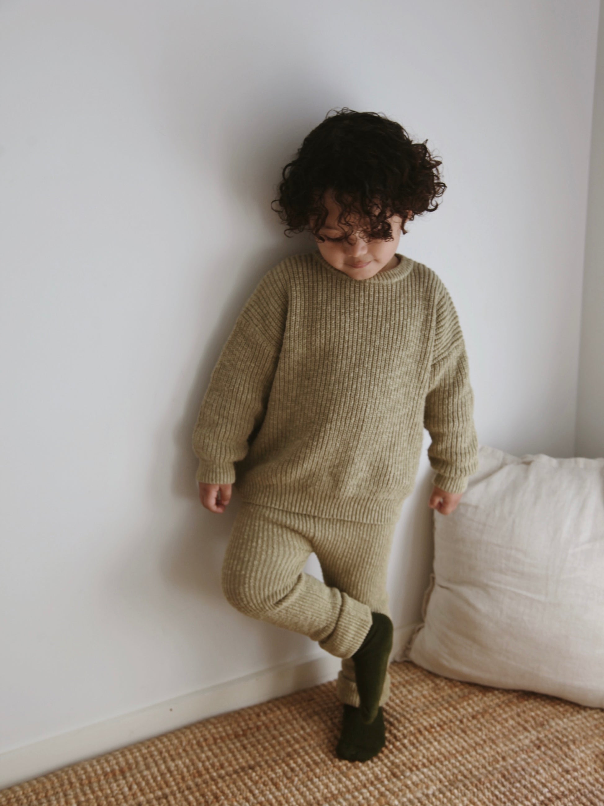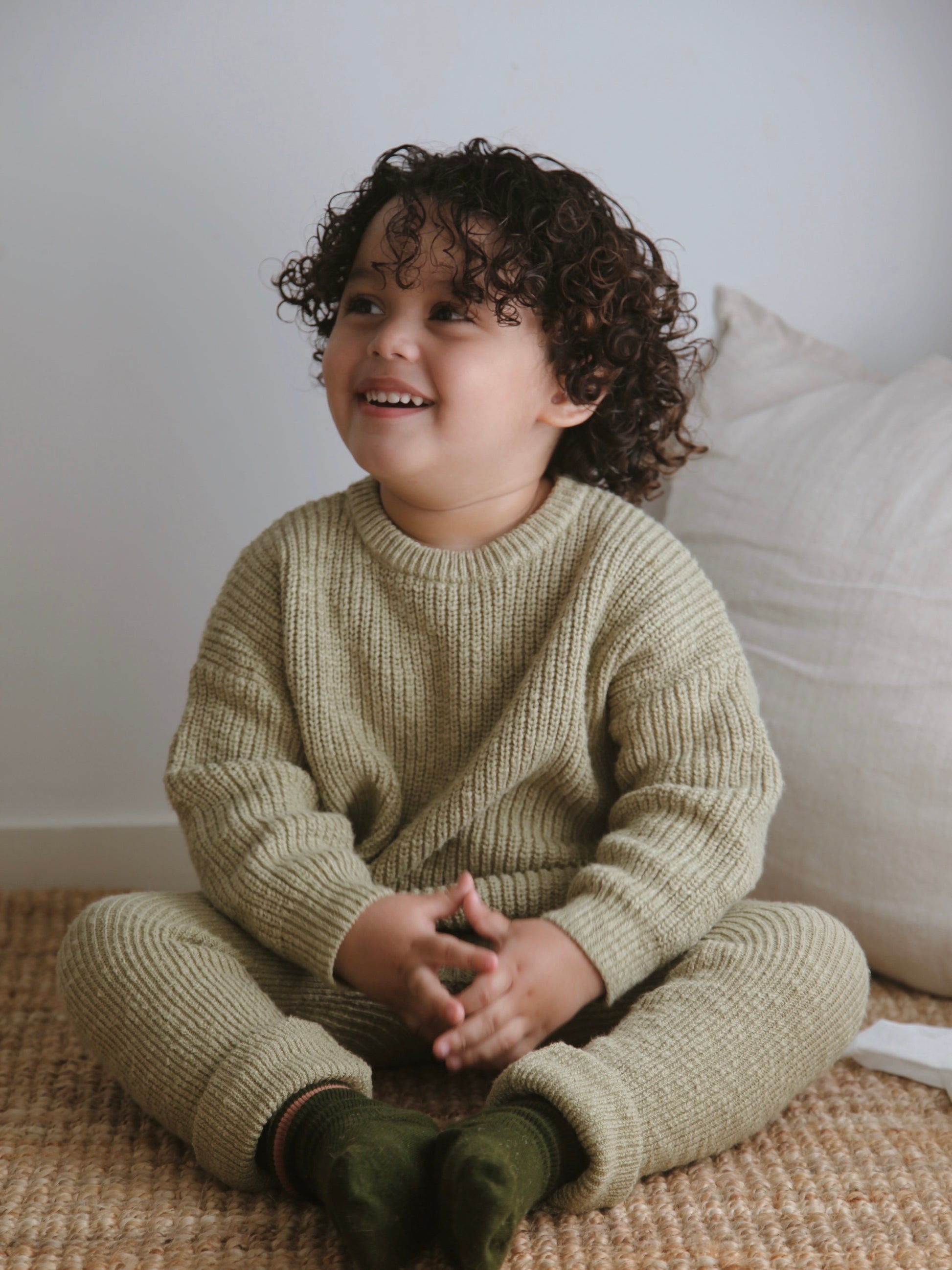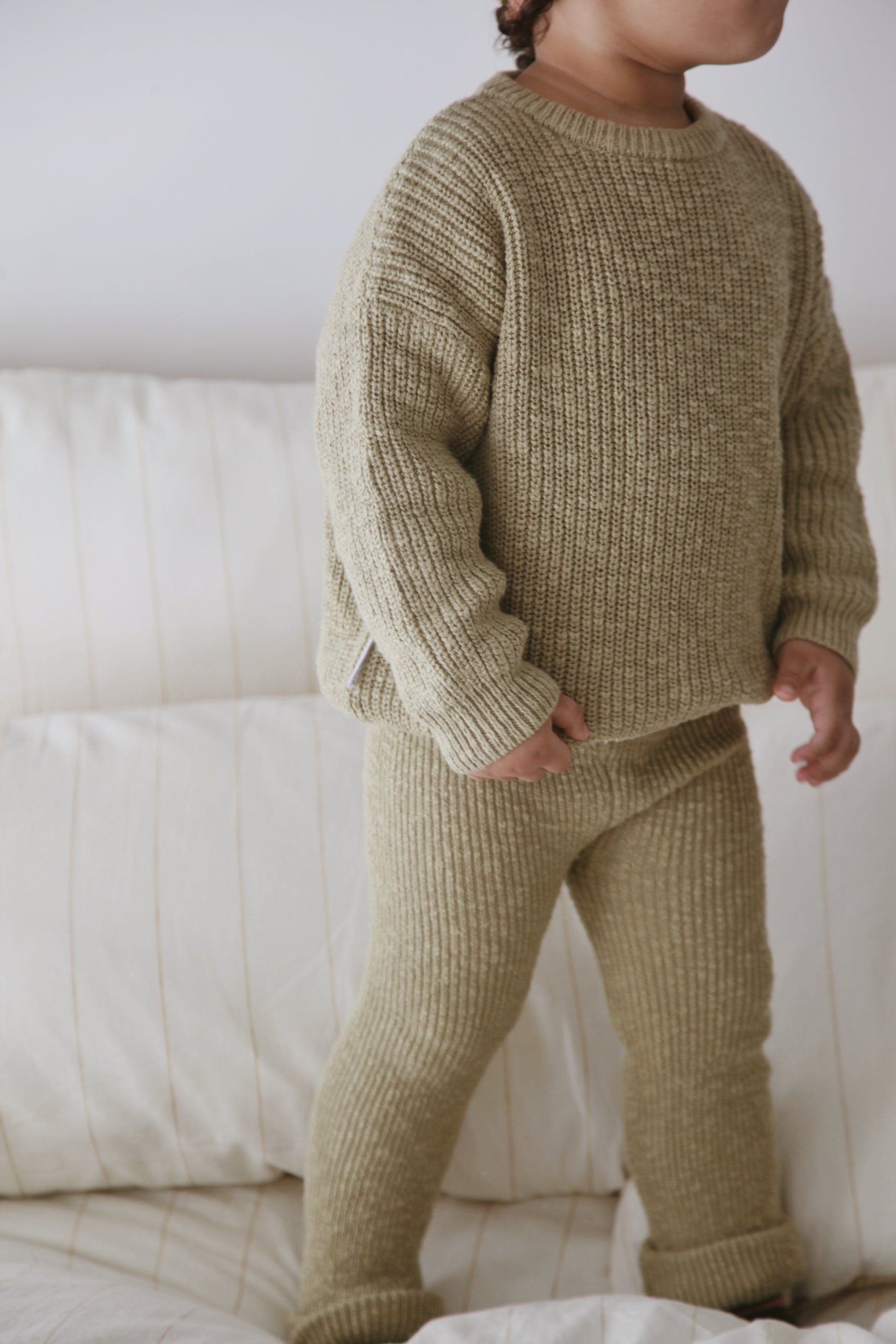 Our original chunky and textured knit jumper in our Olive colour. Pair with items from our Valley Collection.