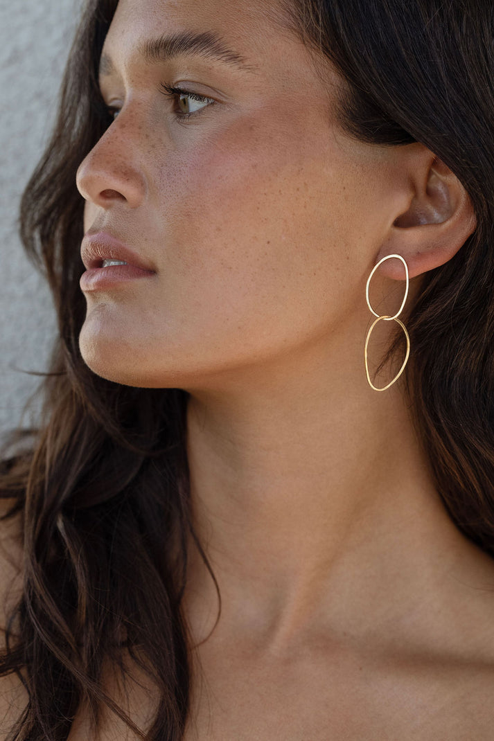 The Never Appart earrings are handcrafted by intertwining two imperfect shaped ovals with the second one being free moving which makes them look slightly different every time one looks.
