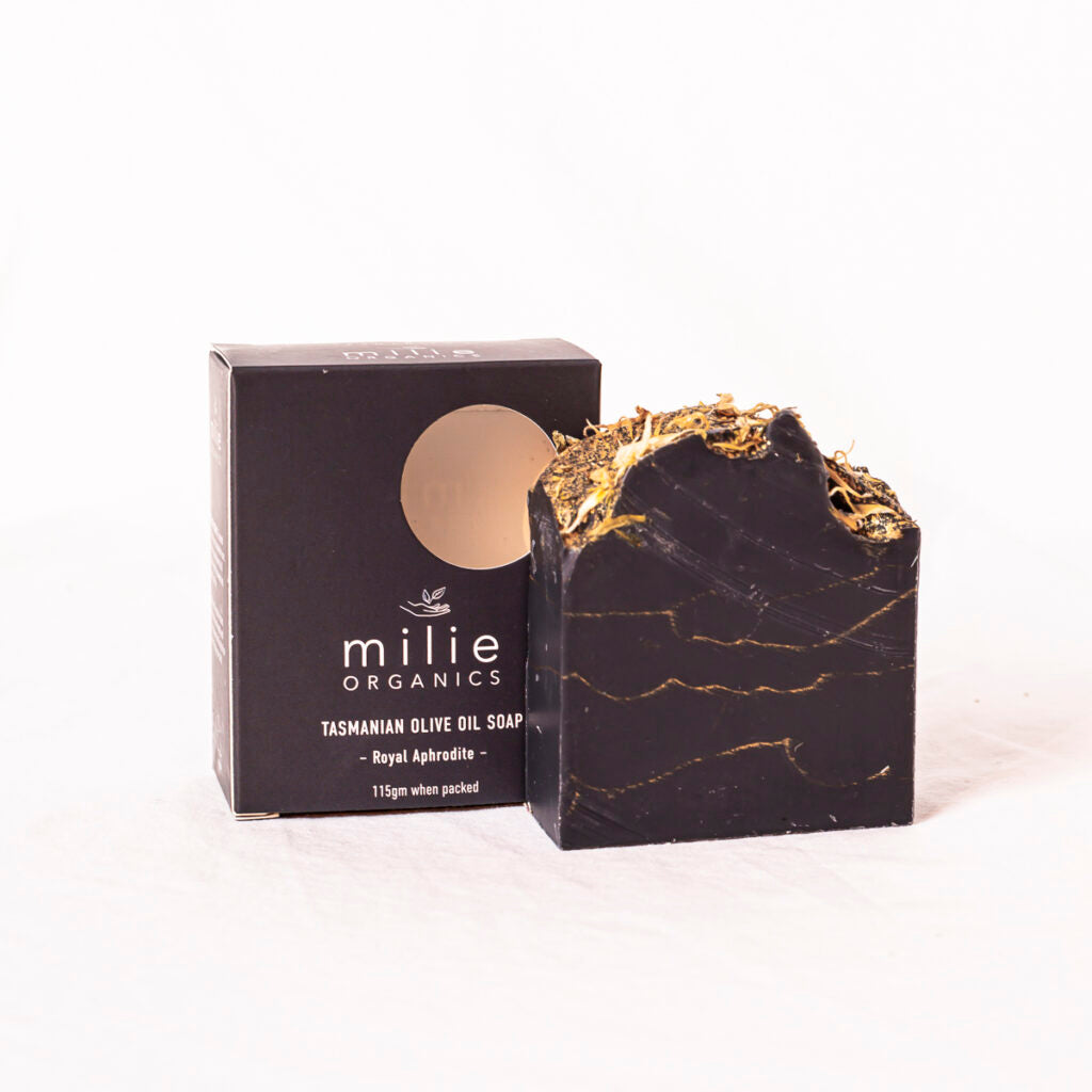 Royal Aphrodite: Saponified Tasmanian Extra Virgin Olive Oil, Coconut Oil, Organic Babassu Butter, Hexane-Free Castor Oil, Non GM Tasmanian Canola Oil, Essential Oils of Grapefruit Patchouli, Ylang Ylang & Sweet Orange, Activated Charcoal, Gold Mica, Calendula Leaves.