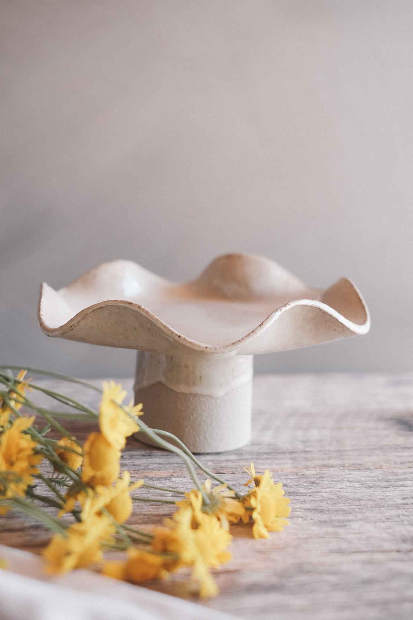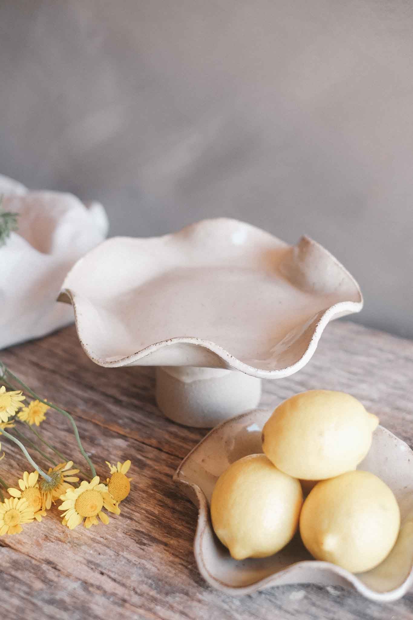 Hand formed and raised on a pedestal base, this bowl features soft, organic ruffles that move gently around the rim. The form feels fluid and natural, with each ruffle shaped by hand, making every piece slightly different.