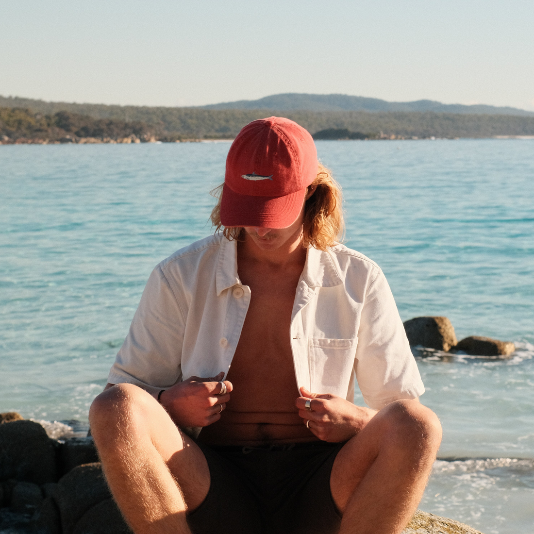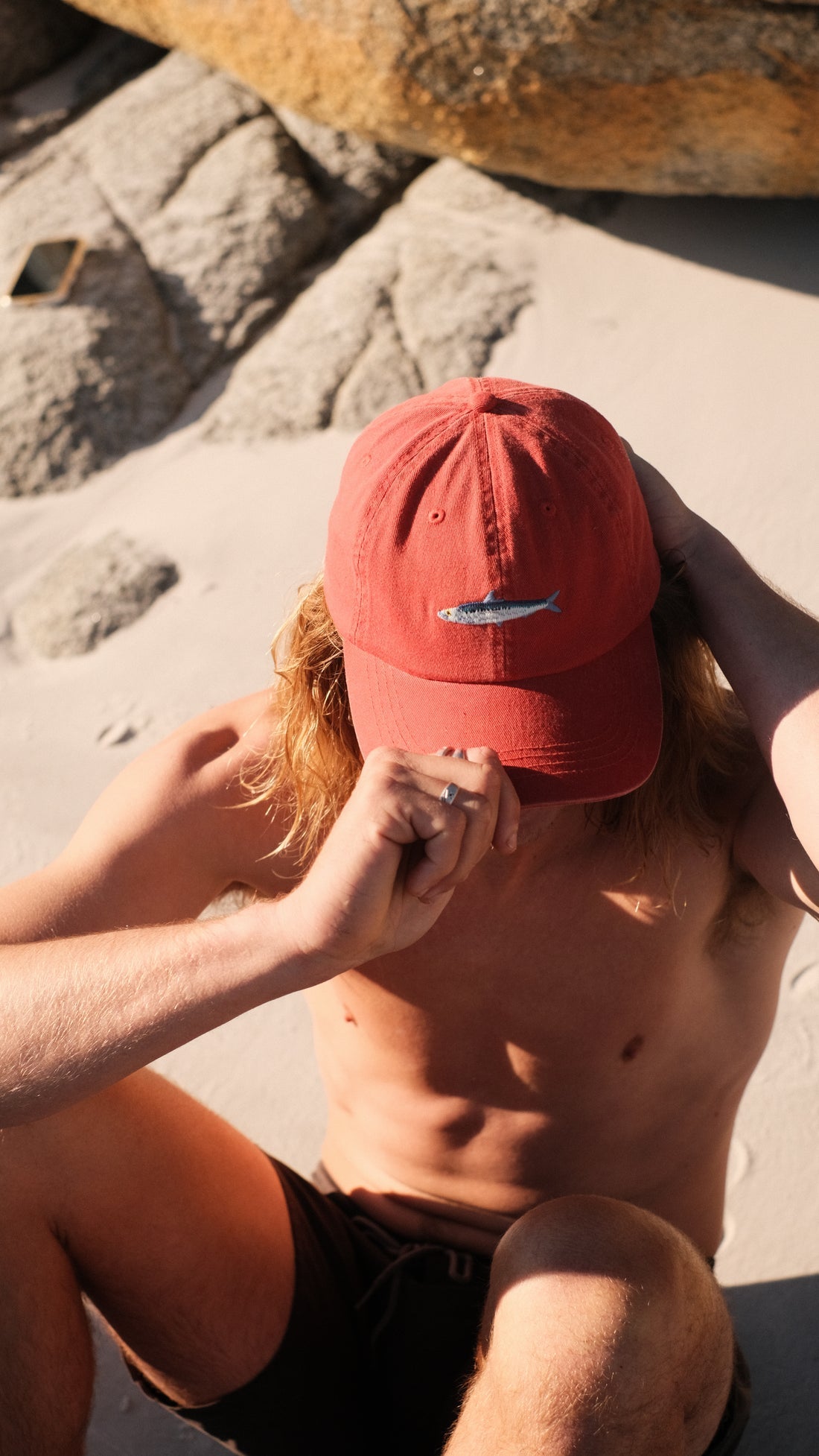 The Sardine Lid (Sardinops sagax) is a premium cotton dad cap in a punchy, tomato sauce red. Soft but structured. Relaxed but refined. Embroidered with a hand-drawn sardine, because small fish can still make a splash. She’s got a plastic-free clasp, recycled plastic brim, and just the right amount of “yeah I fish” energy - even if you only fish for compliments.