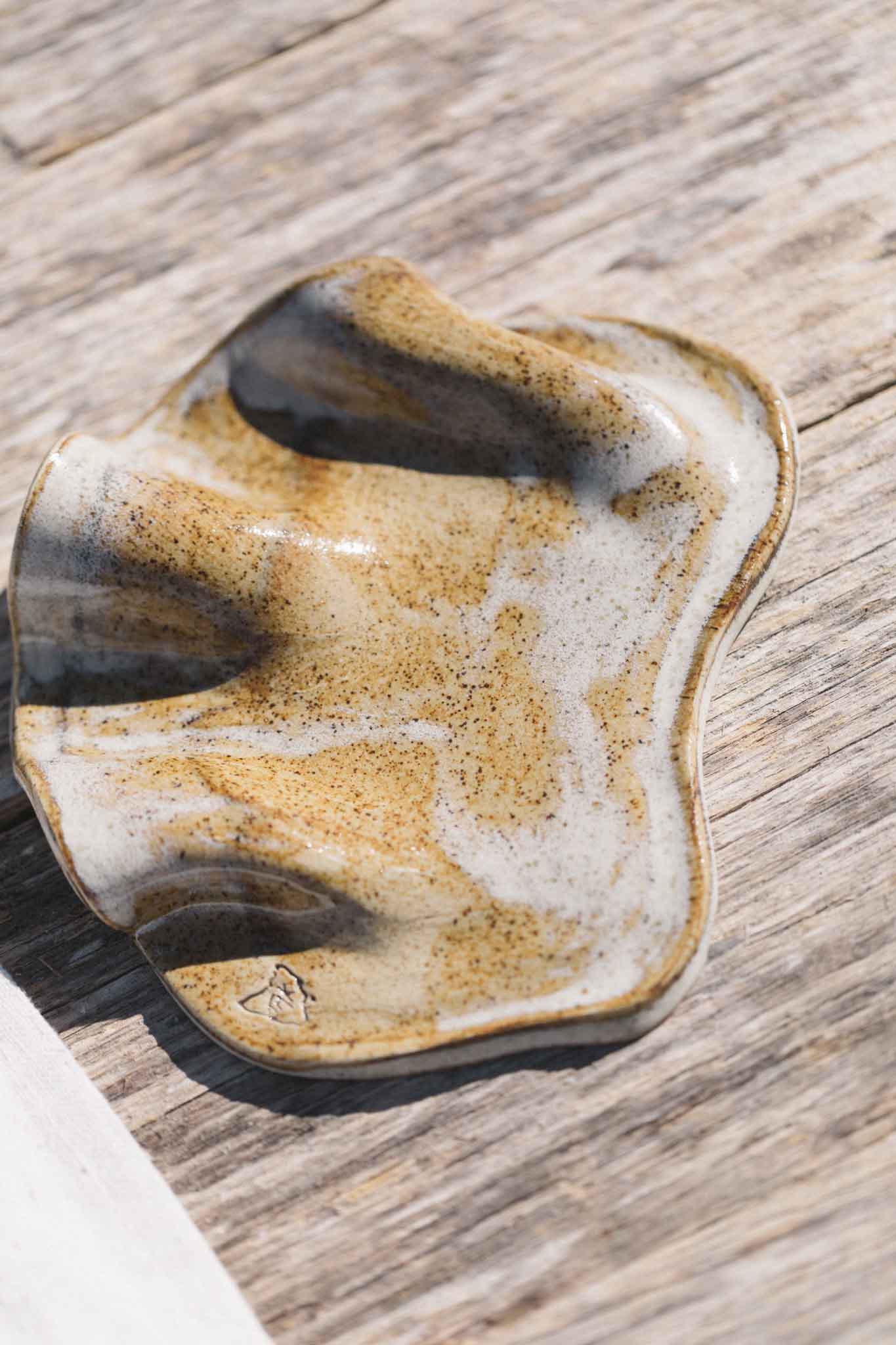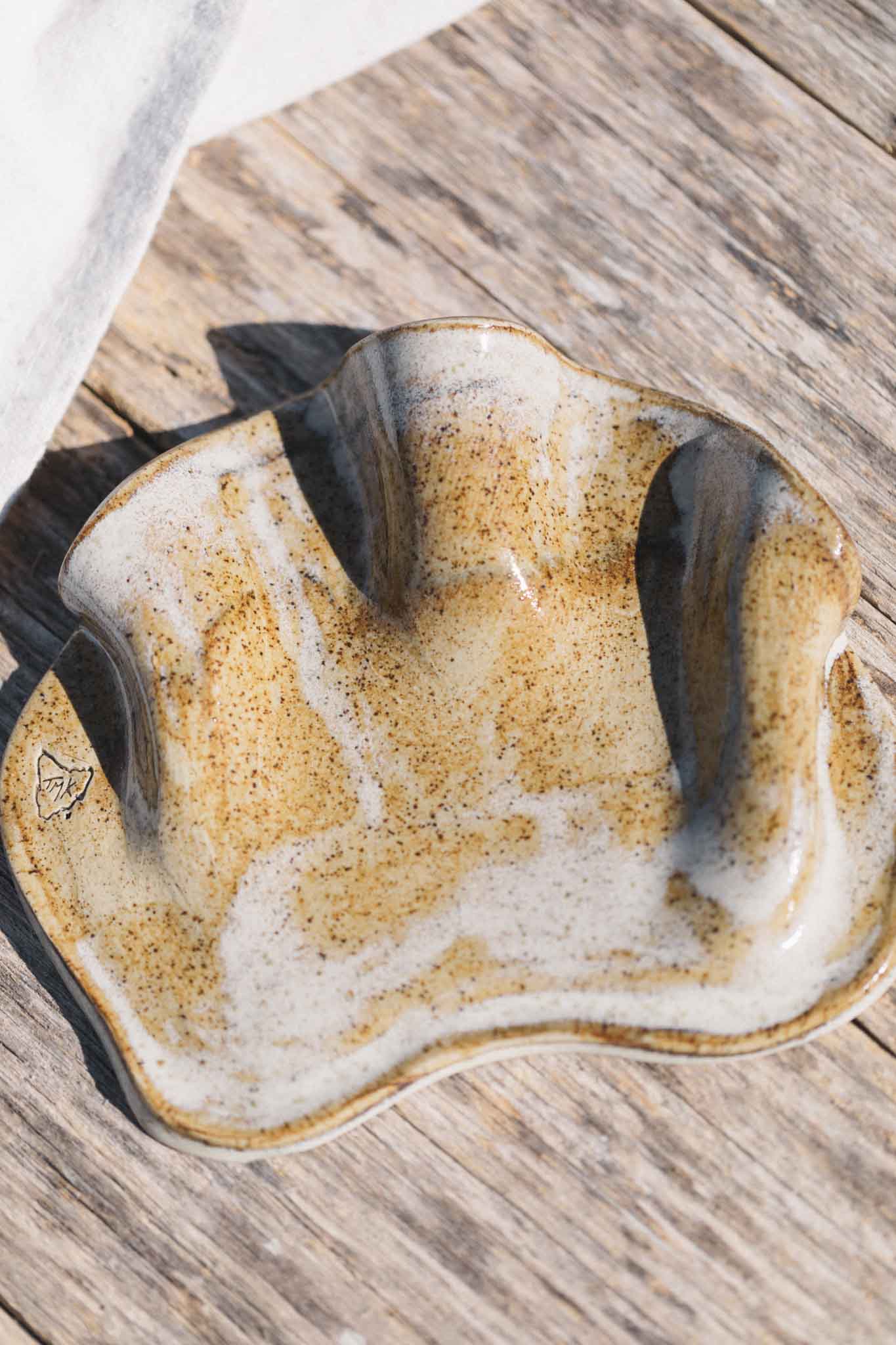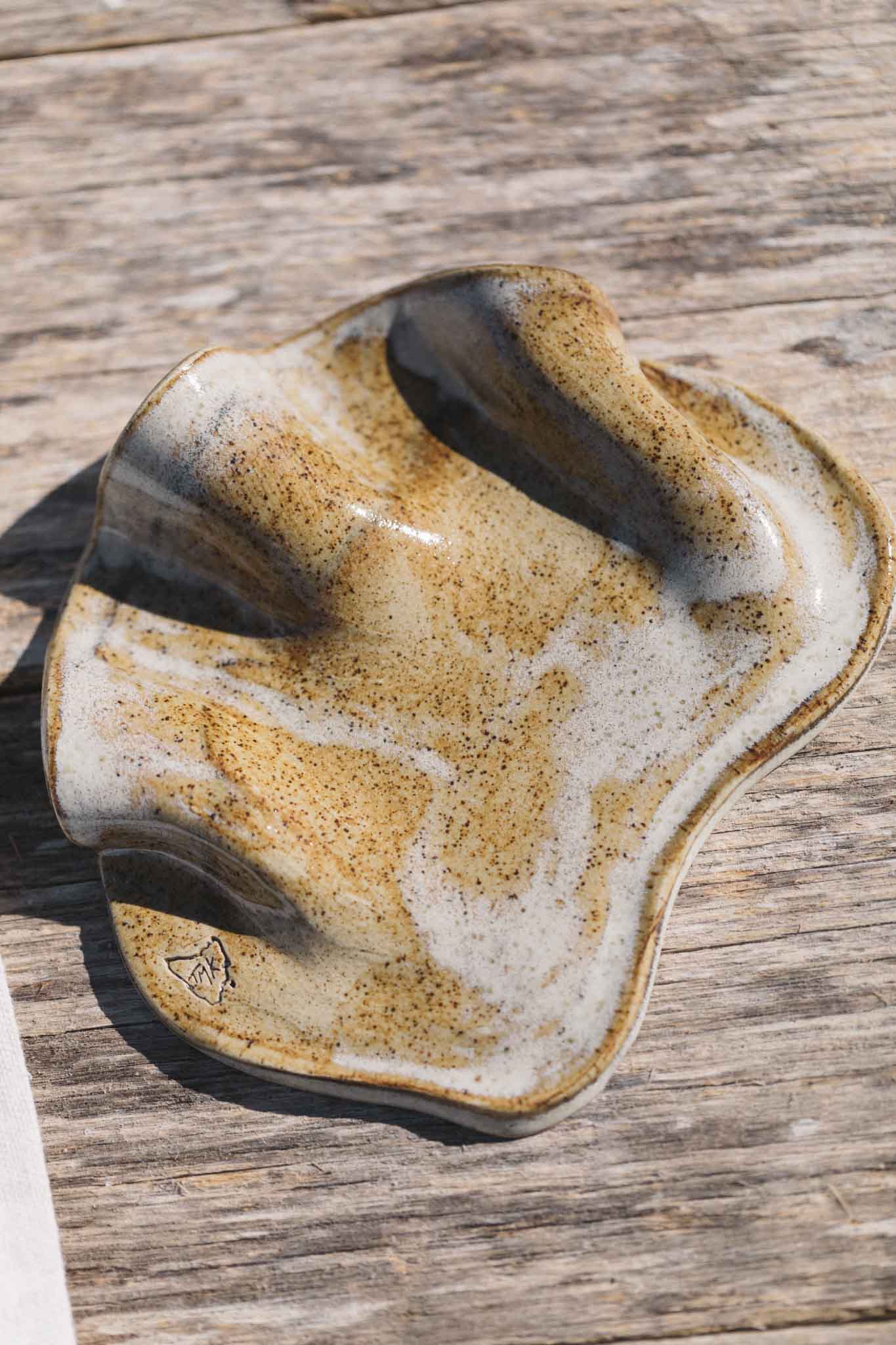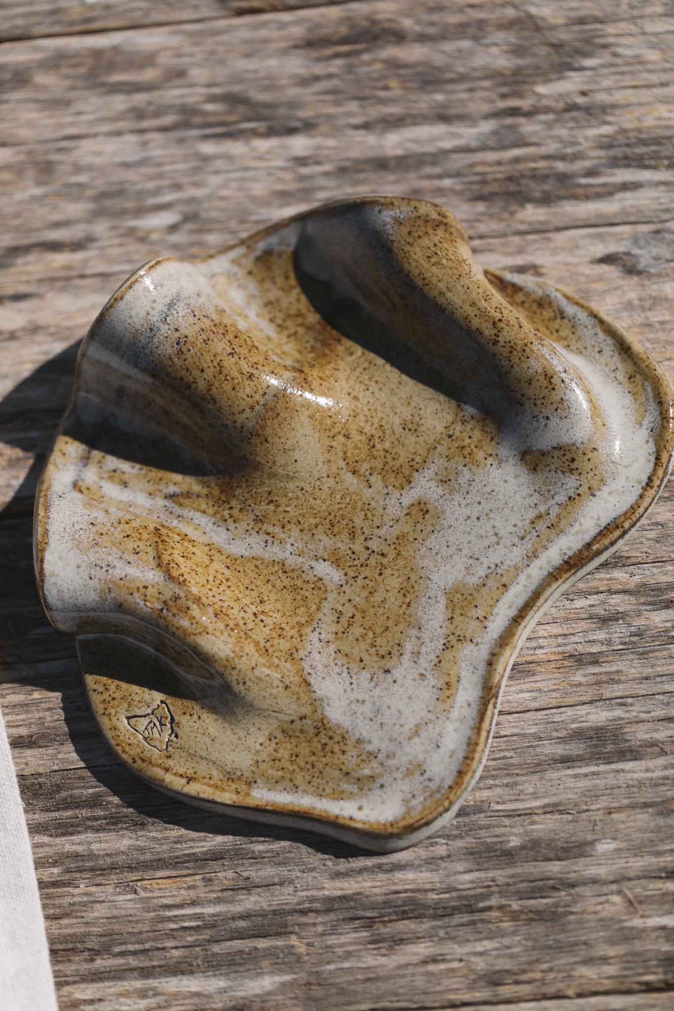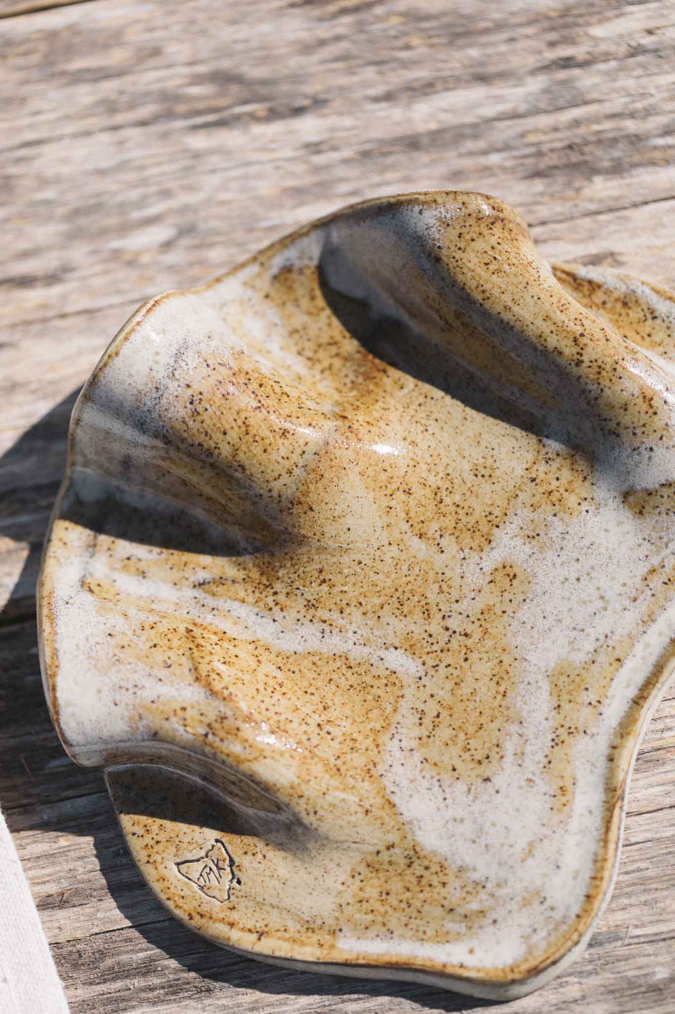 Elevate your next gathering with this handcrafted wild clay charcuterie board. Expertly manipulated to create a flowing, organic shape, this piece is designed to hold fruits, cured meats, and cheeses in an artful, elegant way that turns your spread into a work of visual delight.