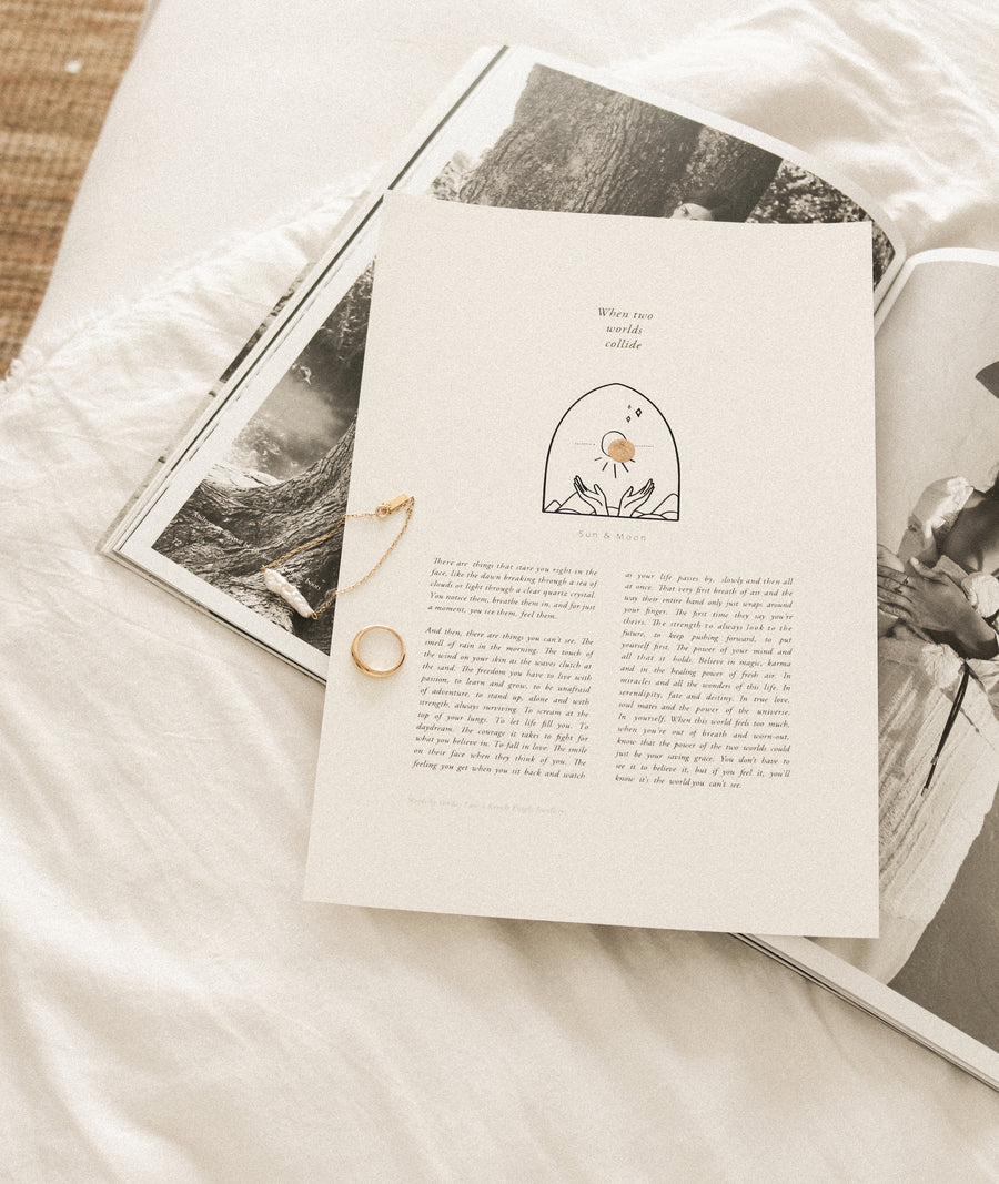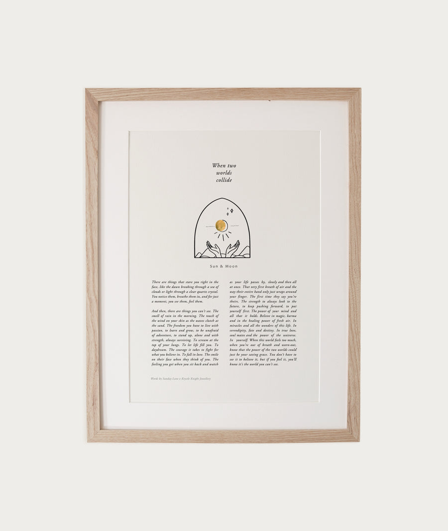 We teamed up with the beautiful woman behind Krystle Knight Jewellery to release our special edition 'Two Worlds’ print. Detailed with a hand foiled golden sun. Written and illustrated by Sunday Lane, in our Brisbane studio. Printed onto 215gsm off-white felt card.