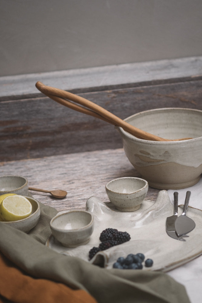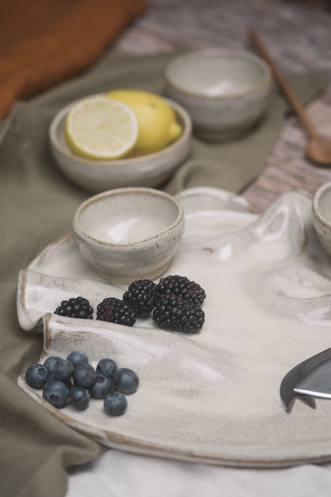 Elevate your next gathering with this handcrafted wild clay charcuterie board. Expertly manipulated to create a flowing, organic shape, this piece is designed to hold fruits, cured meats, and cheeses in an artful, elegant way that turns your spread into a work of visual delight.